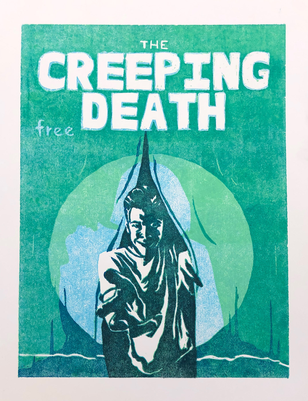 "Creeping Death" is a 5 step, 9"x12", reduction woodcut.